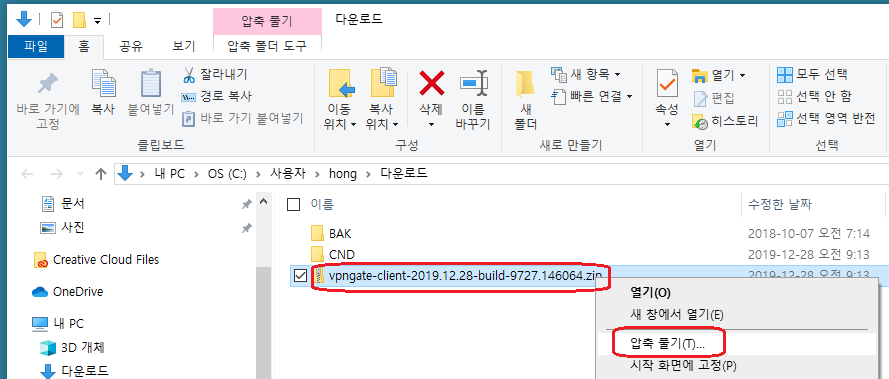다운로드한 압축파일을 오른쪽 클릭을하여 압축 풀기를 클릭한다.